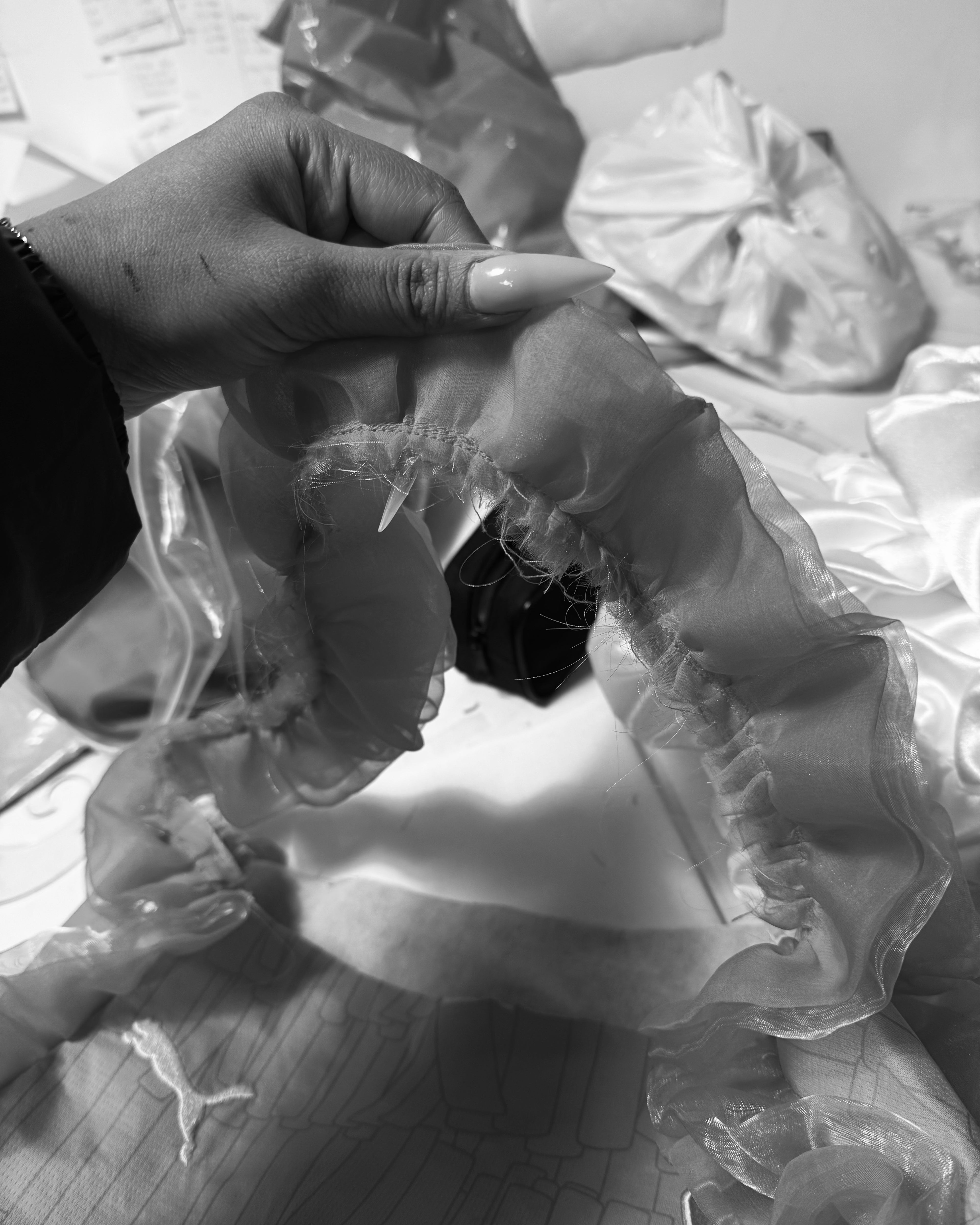 Notre démarche repose sur une conviction simple : le tissu est au cœur de la création. Plus qu’un support, il incarne une identité, une culture, une histoire. Nous choisissons de mettre en avant la matière avant la forme, pour laisser le tissu s’exprimer pleinement et révéler sa force esthétique.